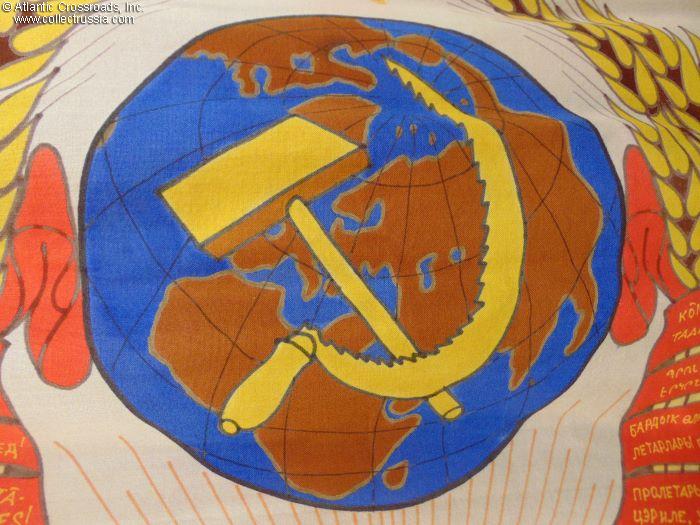 Medium size, 67" x 46" (approx. 5 x 3.5 feet.) This uncommon flag is like a regular Soviet naval ensign but instead of the star and hammer & sickle emblem it has the national emblem of the USSR. When raised on the mainmast of a naval ship, it designated that the Supreme Commander was onboard. The canvas hoist sleeve has GOST-81 manufacturing standard code, name of the manufacturer (Galantereynaya Factory), and a 1985 date of manufacture.