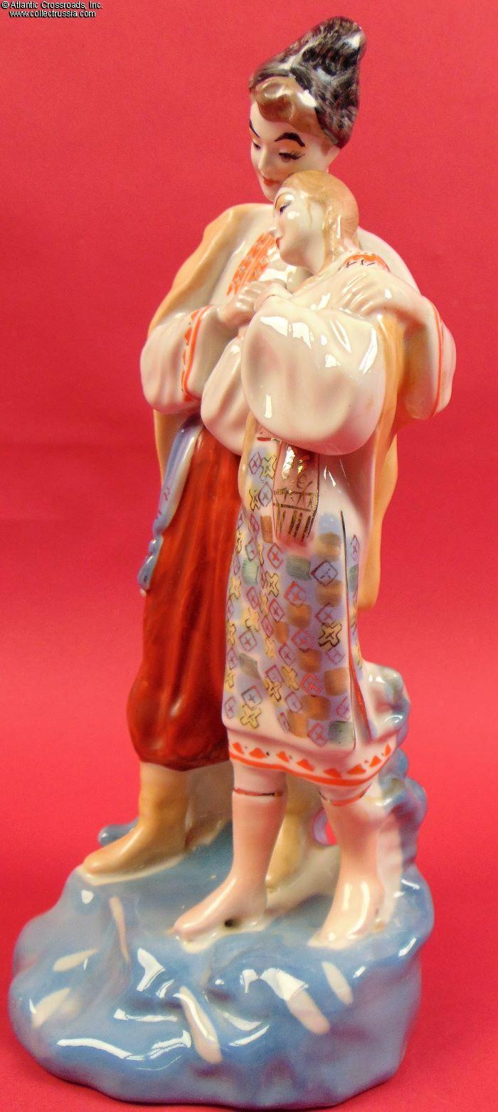 The figurine is quite big, weighs a little over 2 lbs. and measures 11 ¼" (28 cm) in height; the plinth is 4 5/8" x 4 ¼" (11 x 10.5cm). The Cossack Levko and his girlfriend Ganna from Gogol's May Night or the Drowned Maiden, the third tale in his Evenings on a Farm Near Dikanka. The young couple are taking a moonlit, springtime stroll. This statuette is also referred to as "Pair in Love" (fig. #676 in Soviet Porcelain, Guide for Beginning Collector.) There is a 1956-1973 style trademark of the Polonnoe Factory on the bottom (#568 in Vol. 1 of the reference guide Marks on Soviet Porcelain, Faience, and Majolica, 1917-1991 by Nasonova et al.)