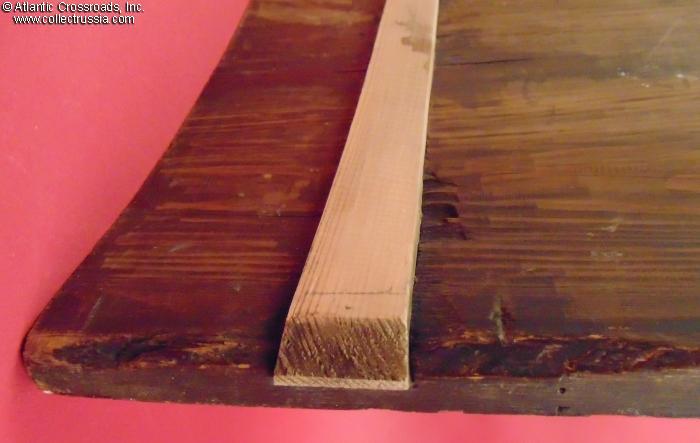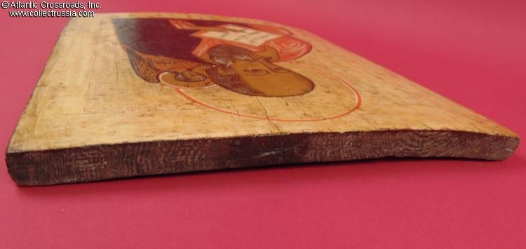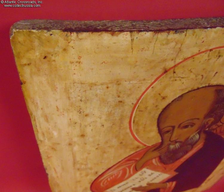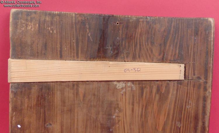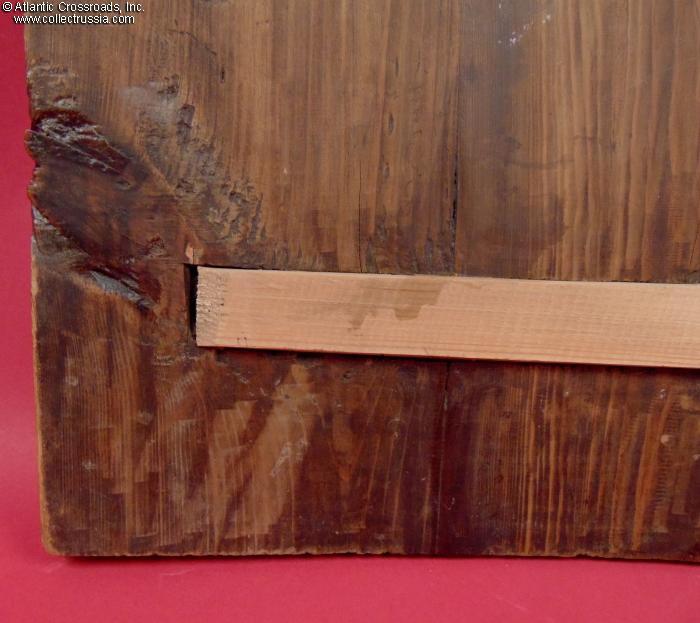 In very good to excellent condition. The lacquer is mostly intact preserving the colors fresh and vibrant. The boards of the icon are structurally sound. The crossbars appear to be later replacements showing notches on the inside to accommodate the curve of the boards. The beginning of a crack on the left side (looking at the reverse) is safely held in check by the crossbars. Between the glue, the crossbars, and the iron staples to the top and bottom edges, the two boards of the icon are held together safely.