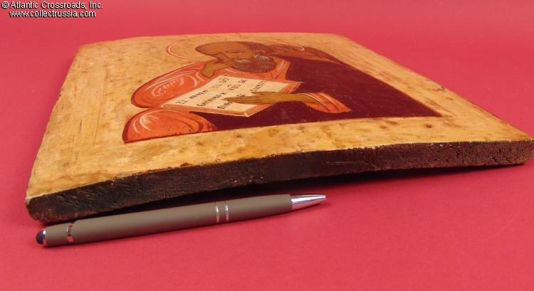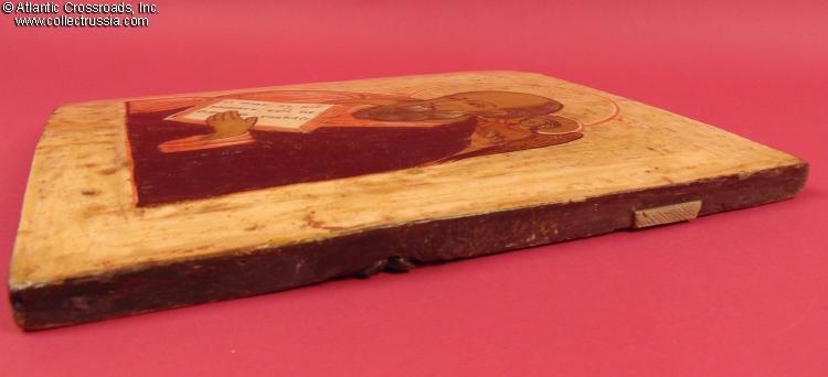 In pigment paints and matte lacquer on wood. Measures 11 ½" x 13 ½", weighs a little over 2 lbs. The image shows St. John the Theologian holding his hand to his lip in a gesture of silence, symbolizing contemplation of divine inspiration. An angel is positioned behind him whispering the Gospel into his ear. The text on the open page in St. John's hands reads "In the beginning there was the Word, and the Word was with God, and the Word was God."