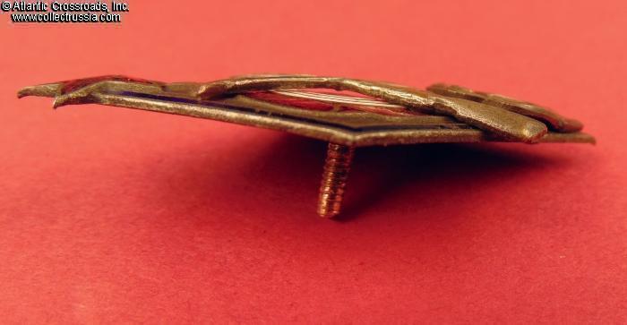 In steel with brass- and silver plating and enamels; measures 50.5 x 30.0 mm; weighs 8.0 g without the washer and screw plate, 10.1 g overall. The crossed rifles and plaque with the Roman numeral "III" are separate superimposed parts attached by wires to the diamond-shaped base. The enamels and the badge overall are of very high quality typical of the pre-WW2 Soviet manufacture.