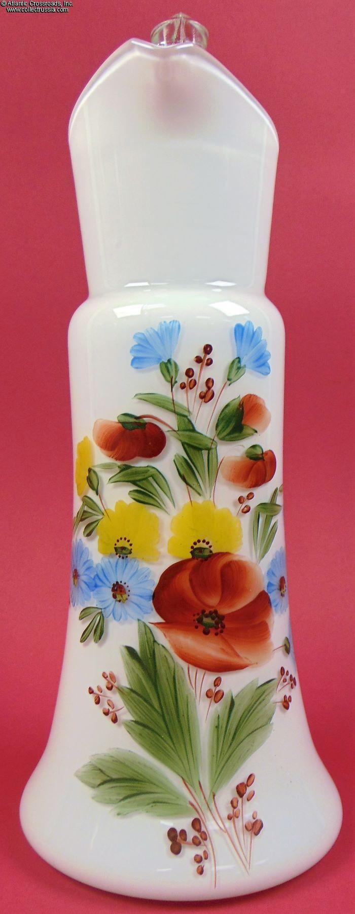 The pitcher is slender and quite tall, stands at about 12 ¼" to the tip of the spout, 14" to the tip of the lid handle, 5 ¾" wide at the foot. The body is bell-shaped, with a slender slightly widening neck ascending to the spout. Made of double-layer milk glass and hand-painted in the "wild flowers" motif, very popular at the time. The artist's mark is on the bottom, a free-form brushstroke in the dominant color of the artwork, traditional mark of the Maltsov glassware artists. It is interesting to note that even though these pitchers were mass-produced, the artwork on each is similar