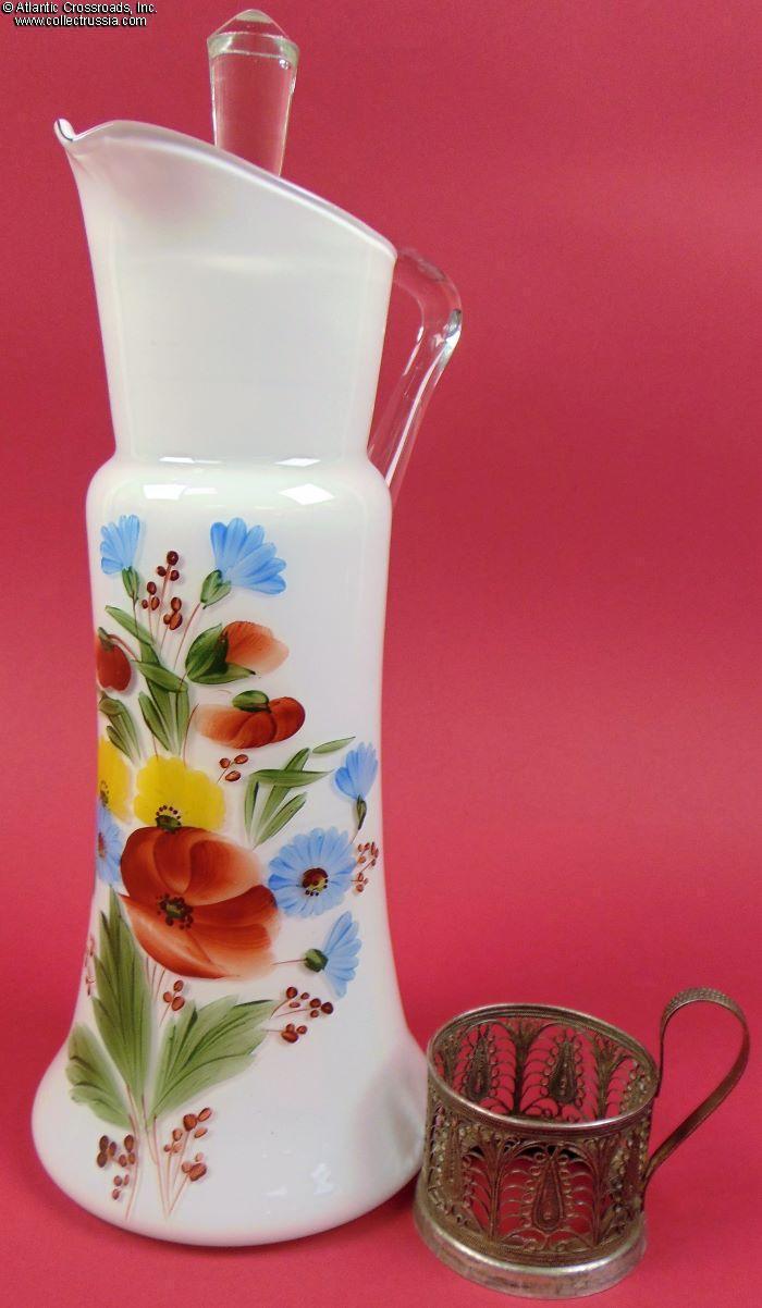 Elegant Pitcher in Milk Glass, Scarce with Lid, Hand-Painted Artwork, by Dyatkovo Crystal Factory, maker marked, circa 1950s-70s.