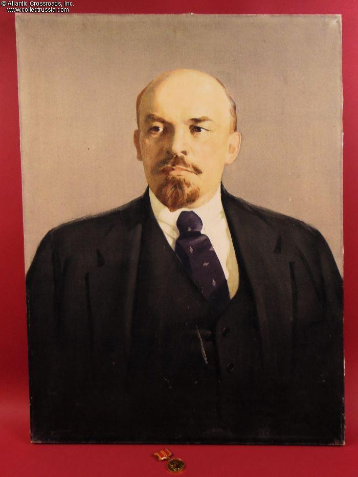 As evidenced by the paper tag of the approval certificate issued on November 25, 1969, by the Leningrad Chapter of the RSFSR Artists Union, this is a licensed and approved reproduction of one of the most widely known portraits of Lenin, reproduced from the original b/w photo. The portrait was done by a professional artist who had official permission to paint Lenin. His name is handwritten on the approval certificate, but not very legibly. Looks like "Balakhonov" but we are not 100% sure of the tail end of the name. However, he was an accomplished artist, as not too many Soviet artists h