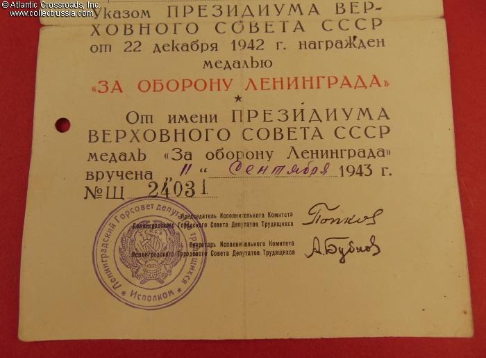 Measures approx. 5¾" x 8¾". This is one of the early style, "large" certificates for the defensive campaign medals which were replaced by booklet style certificates for the campaign medals instituted later in the war. Shows facsimile signatures of the chairman and secretary of the Executive Committee of the Leningrad City Soviet (Council) and the appropriate ink stamp. Note the relatively early, September 1943 date of issue. The verso has some hand-written notes including an abbreviated "Antiaircraft Division" and "Convicted Inc(oming) #2487s / 3 April 1945". Judging by these, the reci