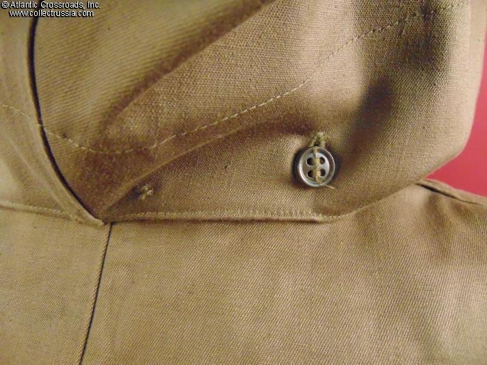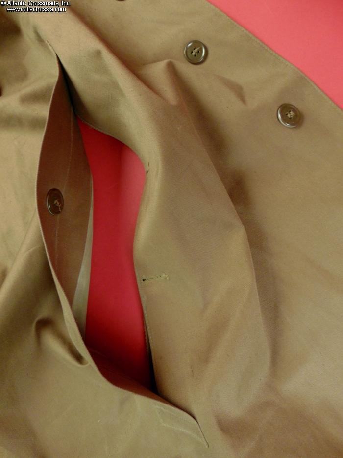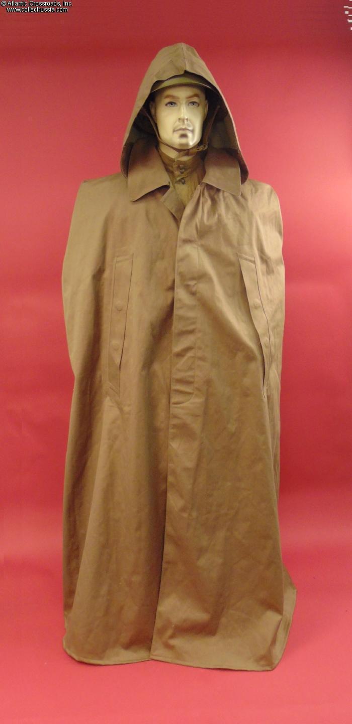 In olive-drab rubberized fabric, with button closure in the front and buttoned slits for arms. The fabric is both lighter and more water- resistant than the more common canvas plashch-palatka shelter quarter for enlisted men and NCOs. Comes complete with a detachable hood in the same material. On the inside near the bottom hem, there is a sewn-in manufacturer's tag of the garment factory in the town of Slavyansk, RSFSR, showing the 1986 date of manufacture. The tag also shows the size of 108 /188 cm (Extra Large / Extra Tall). Designed to be used by an officer while inspecting sentry posts in inclement weather, this raincape is worn over regular service uniform and will fit almost any size.