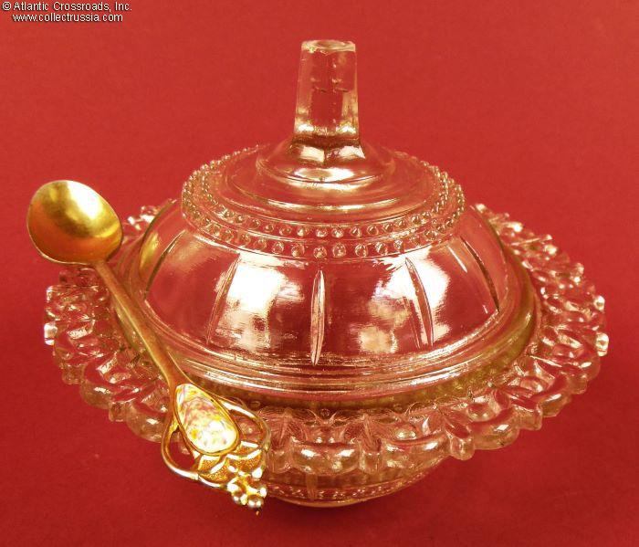 Stands approx. 4 ½" tall to the tip of the lid, 2" tall without. 5 ½" across at the lip, 2" wide at the base. The shape and artwork are formed by casting the glass mass into molds. The decorative design is typical for Gus-Khrustalny glass factories, heirs of the Maltsov glassware empire. Specifically, this dish was made by the Urshel Glass Factory in Gus-Khrustalny District. It is not maker marked but is an exact twin of the one we had recently, marked "сУз", the format of the factory's logo used for just a short period of time, starting in the 1950s up until 1962.