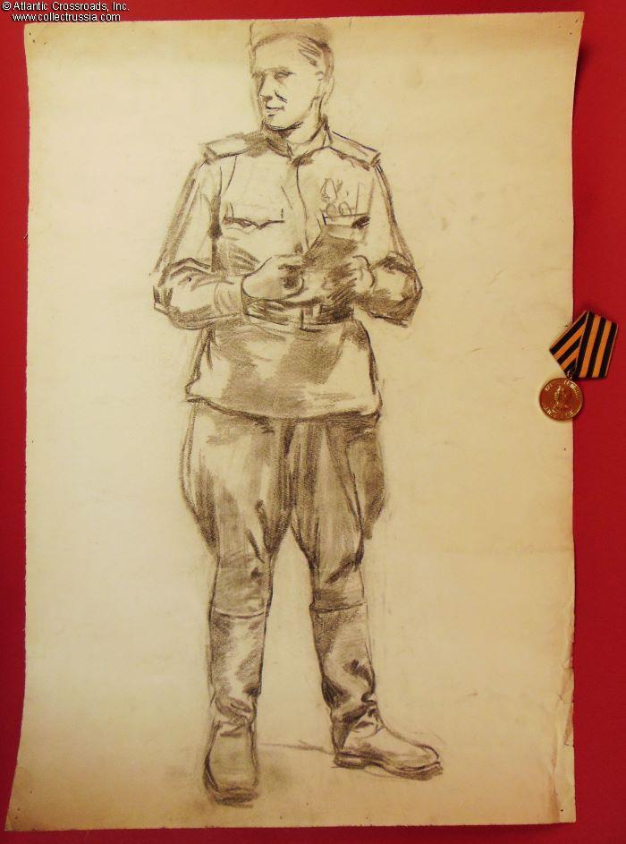 Standing Portrait of a Decorated WW2 Soviet Soldier, in pencil, circa mid- to late 1940s.