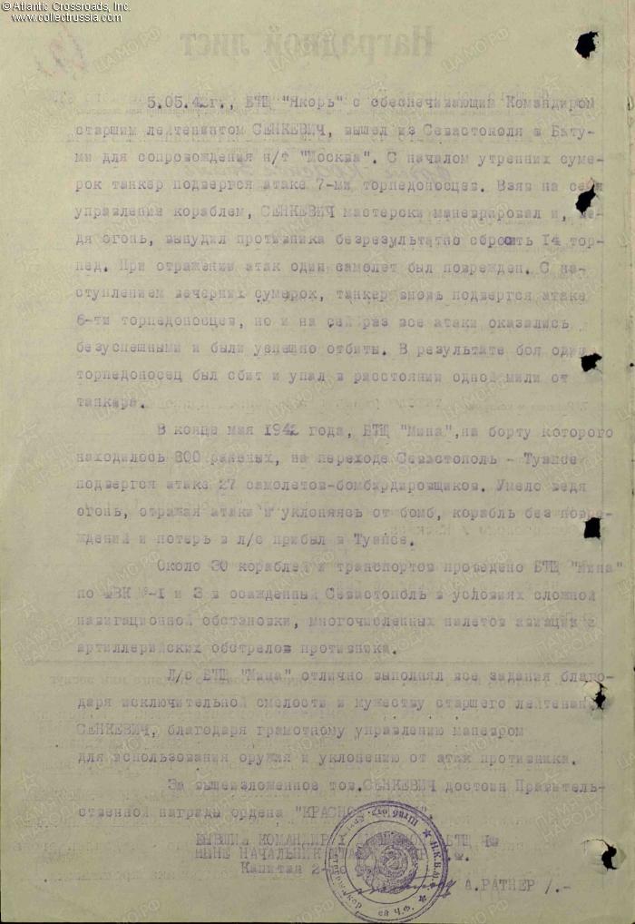 Based on available archival information, Ivan Senkevich was born in 1911 in Belorussia. He joined the Soviet armed forces in 1933 and in 1941-42, fought at Odessa and Sevastopol as commander of a minesweeper of the Black Sea Fleet. In December 1941, during the second unsuccessful German attempt to storm Sevastopol, Senkevich docked his minesweeper Mina ("Mine") in close proximity to the enemy and provided direct fire support to the Soviet ground troops. His courageous actions in this engagement helped to silence two enemy artillery batteries and repel the attack. In May 1942, Senkevich was temporarily acting as skipper of the minesweeper Yakor ("Anchor") which successfully escorted the tanker Moskva from Sevastopol to Batumi while repelling repeated attacks of German torpedo bombers. In the process, the minesweeper shot down one of the enemy planes and damaged another.