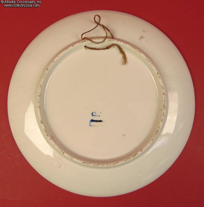 Large format measuring a little over 1 ft. across. Rather massive, weighing close to 3 lbs. Made by an unknown maker. The bottom is marked with initials "ПР" (PR). The plate comes with a hanging rope which appears to be original. Note: a few strands of the rope have unwoven and may be at risk of snapping when under a load.