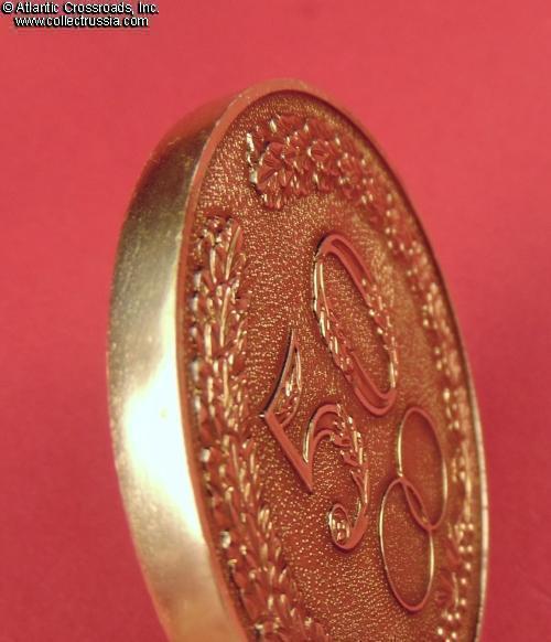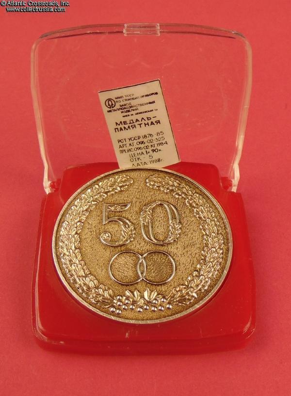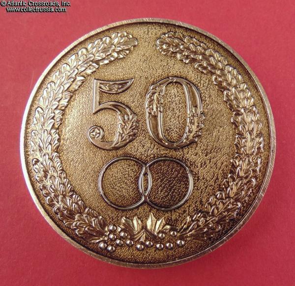 The medal is in anodized aluminum, measures 74 mm wide. The obverse features the numeral 50 and intertwined wedding bands surrounded by an oak and laurel wreath. The reverse has the Soviet star at the top and the hammer and sickle at the bottom, leaving the middle frame blank perhaps for inscribing the happy pair's names and date of the golden jubilee.