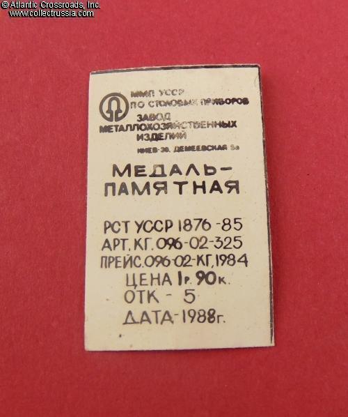The box is made of hard plastic, approx. 5" x 4" x 1". The fitted space for the medal and the inside of the lid are covered in synthetic felt. Loose inside the box is the original paper tag of a factory in the city of Kiev showing the 1988 date of manufacture.