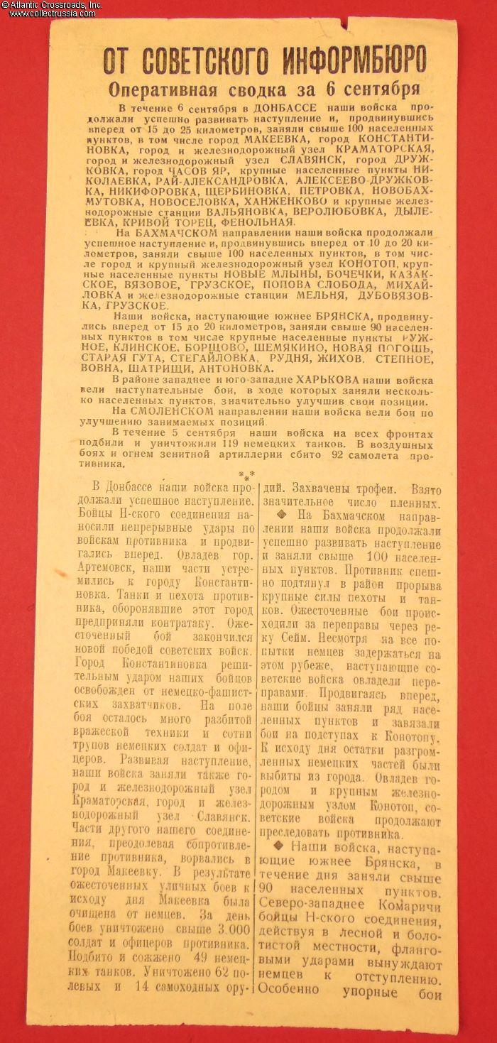 Single page 4 ½" x 11", front and verso. Circulation 350 copies. The communique cites successful operations in the Donbass Region, listing multiple liberated localities, such as the cities of Makeevka, Slavyansk, Chasov Yar, Alekseevo, and others. Also cited are advances of the Soviet Army near Bryansk and to the south and west of Kharkiv. The Baltic Fleet and its naval aviation are mentioned as well, for sinking several enemy transport ships. The last paragraph lauds efficient subversive actions of the partisan forces in Kalinin Region, where they killed and wounded 80 German troops and captured 5 submachine guns, 112 rifles and a lot of ammunition.