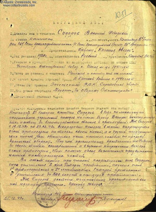 Sidorov earned his first decoration of the war in December 1943 in action near the village of Shevchenko in southern Ukraine. At the time, he already had the rank of Captain and was serving as an artillery battery commander with the 467th Light Artillery Regiment, 75th Light Artillery Brigade, 26th Artillery Division, Reserves of the Supreme Command - the position he would occupy through the end of the war. From 19 - 23 December, during the efforts to completely clear the eastern bank of the Dnieper River, he was constantly at a forward observation post correcting artillery fire not only for his own regiment, but also other artillery units. His timely and skillful fire direction allowed to destroy two German artillery batteries, neutralize one artillery and two mortar batteries, and eliminate up to 200 enemy soldiers. Shevchenko's regiment commander subsequently recommended him for the Order of the Red Star which was awarded on 5 January 1944.