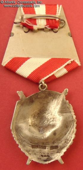 Silver gilt, enamels. Measures 45.1 mm in height (incl. the eyelet and the lower extensions of the torch and flagpole), 36.9 mm in width; weighs 20.9 g not including the suspension and connecting link. This variation is transitional between Type 2 and Type 3, and its obverse is identical to Type 2 screw backs in high serial number ranges. The variation appeared immediately after the regulation change in June 1943. At that point the yet unfinished screw backs still in the production line were converted at the mint to suspension. This was achieved by inserting a small trapezoid-shaped wedge of silver to accommodate an eyelet for suspension. The wedge itself and the variation are often referred to as "swallow tail" or "lastochkin khvost" in Russian (the technically correct term would be dovetail, a carpenter's term for the interlocking joint which connects the two pieces of metal). This particular piece belongs to the first of the two "Swallow Tail" sub-variations, featuring a slightly arched first word of the mint mark. According to the published mint records, the serial number range for both sub-variations of the "Swallow Tail" is 79826 through 84250.