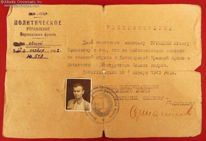 Temporary Photo ID of an Officer of the Political Deptartment, Voronezh Front, issued during the Battle of Stalingrad, dated 17 November 1942.