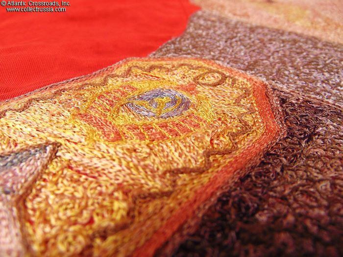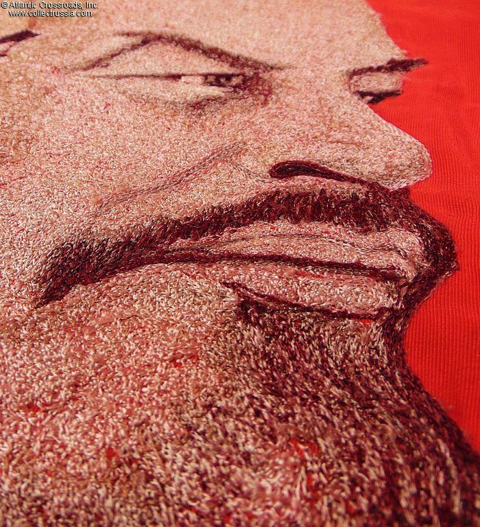 In heavy two-layer scarlet silk with gold fringe on three sides. Measures approx. 49" x 43" including the 3"-wide flagpole sleeve but excluding the fringe. All the artwork and text are embroidered. The obverse features the customary for Stalin-era flags dual profile of Stalin and Lenin but, quite uncommonly, Stalin is depicted in his generalissimo uniform, a victorious juxtaposition to Lenin's plain black suit jacket. The lettering begins with the requisite "Proletarians of all countries, unite!" Communist motto of world domination, followed by "To the Winner of Socialist Competition am