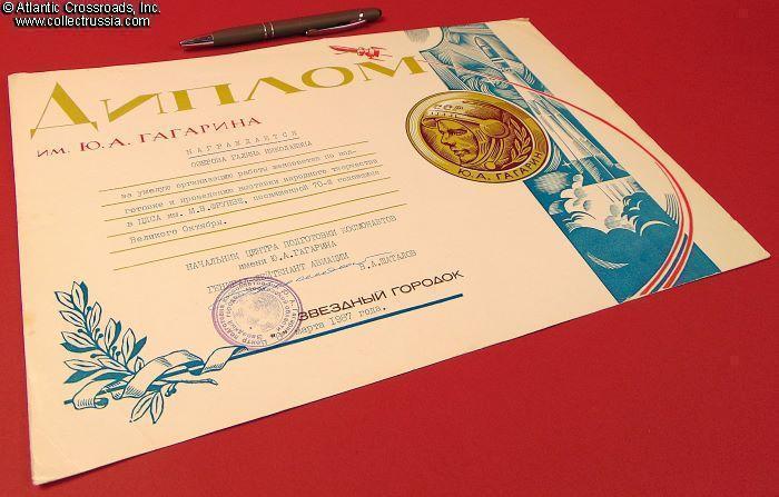Gagarin Center Honorary Certificate to Galina Ozerova (Галина Николаевна Озерова) for organizing a folk art exhibition, hand-signed by Cosmonaut Vladimir Shatalov, 1987.