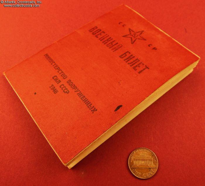 Measures 3 ¼" x 4 ¼", in red oilcloth-bound cover. The front cover features the Soviet military star on top with "USSR" split in two on both sides of it. Below is the inscription "Military ID" in large capital letters, followed by "Ministry of the Armed Forces of the USSR, 1946" at the bottom.