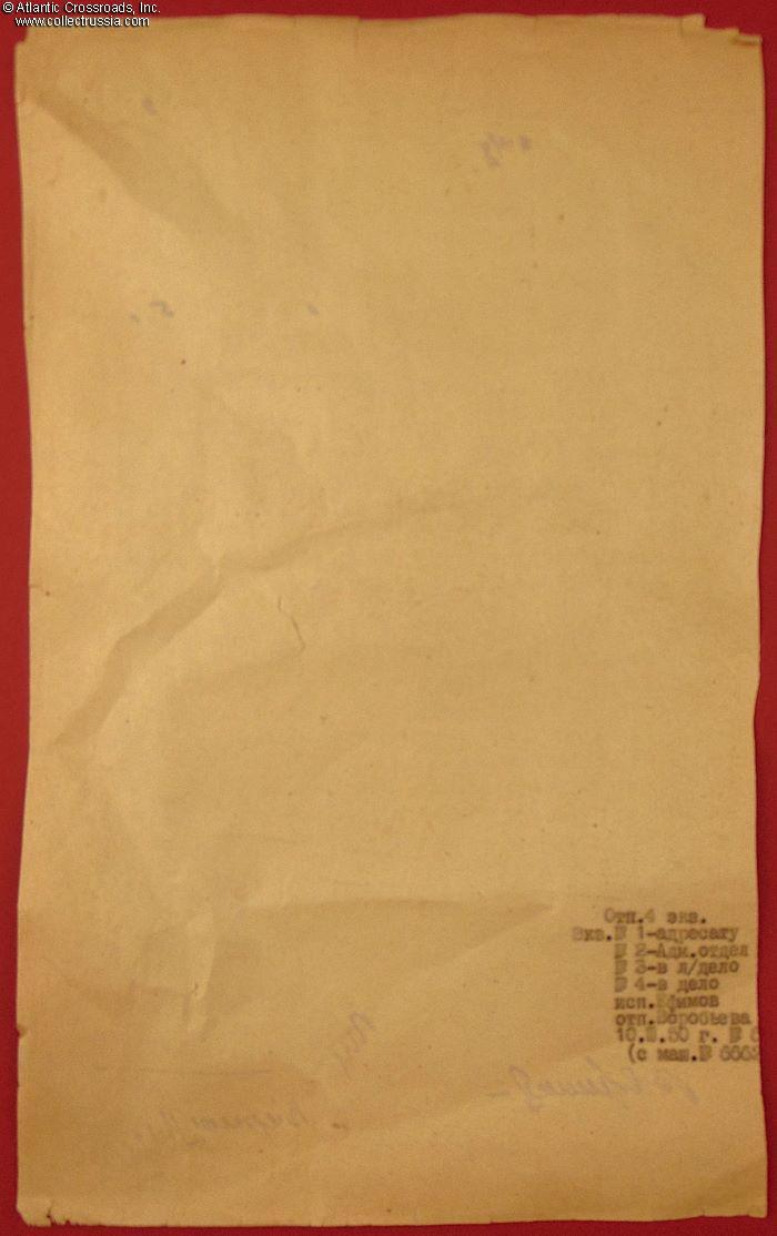 Single sheet 7 ¼" x 12", front and verso. Marked SECRET at the top right-hand corner, third copy of the four carbon copies made. The entry on the verso specified that the third copy was for the officer's personal file. The recommendation was compiled by N. Pupyshev, no rank or post stated. As a reference, Pupyshev states that Admiral Yumashev is in agreement with the promotion.