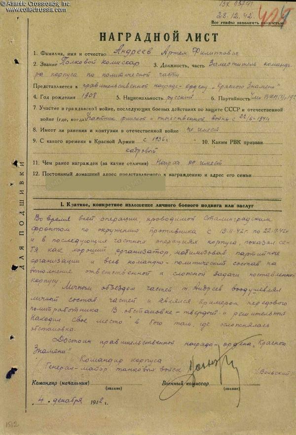 On 9 December, even as the fluid battle west of Stalingrad was still unfolding and its outcome yet far from certain, Artyom Andreev was recommended for the Order of the Red Star by the Commander of the 4th Mechanized Corps, Tank Corps Maj. Gen. Volskiy. The award commendation, one of the earliest for the Soviet counteroffensive at Stalingrad, stated that Andreev had been on the forefront uninterruptedly, organizing the troops and constantly showing firmness and decisiveness in most difficult situations. He thus set "an example of a foremost political officer." The decoration was approved on 21 December by the command of the 57th Army but was officially bestowed by a decree of the Supreme Soviet only on 22 February 1943, on the eve of the Red Army 25th anniversary and three weeks after the German surrender in Stalingrad.