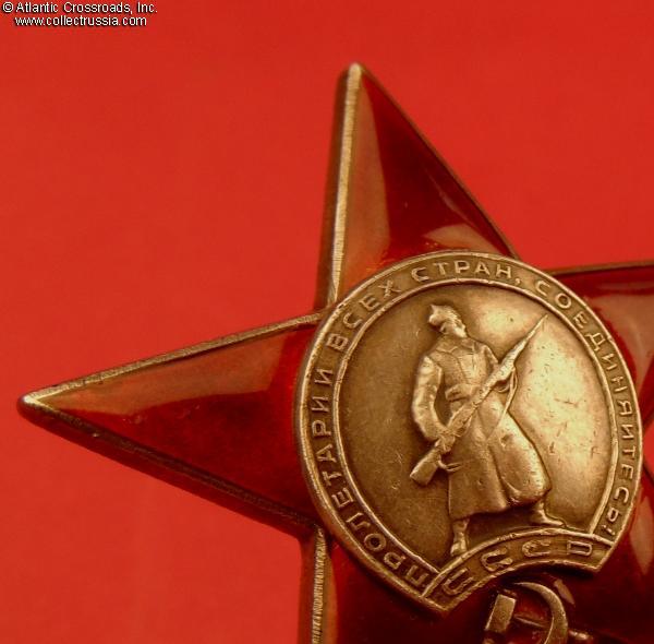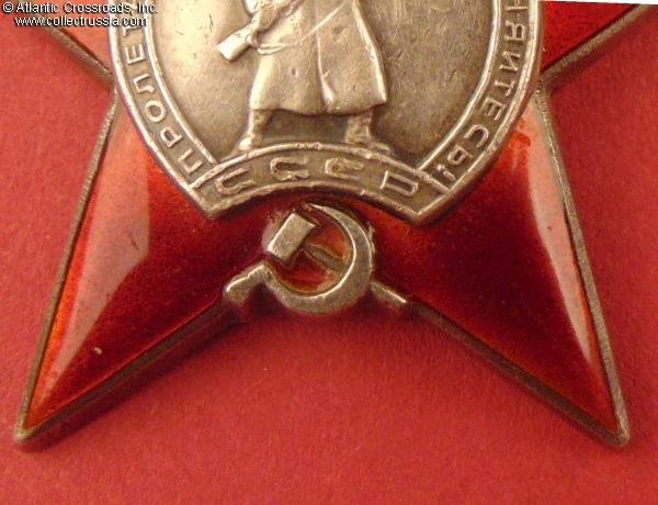 Silver, enamel; 46.3 mm tall x 48.1 mm wide; weighs 29.4 g without the screw plate. This specimen was manufactured in 1943 at the Moscow Mint. Features screw post base and slightly curved up mint mark with the last letter in the word "Monetnyi" having a dash located above the letter. The screw post base is "sunk-in"; its upper edge is approximately flush with the surface of the reverse. /N. Strekalov, V. Durov, "Order of the Red Star", pp. 230, 231/.