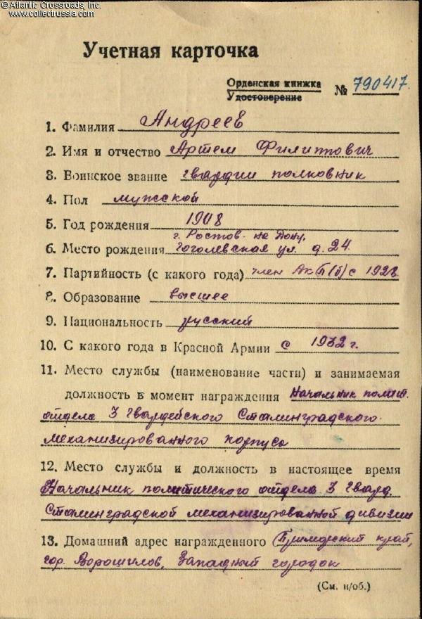 Andreev would go on to earn several other combat decorations: the Order of the Patriotic War, 1st cl. in Nov. 1943; Order of Lenin in July 1944 for the Operation Bagration; and the Order of the Red Banner, also from July 1944 and not a length of service award. After the war, he added a length of service Order of the Red Star and Order of the Red Banner to his already very impressive war chest. As of October 1946, he was still serving with the 3rd Guards Mechanized Corps as its deputy commander and chief of the Political Department. Andreev remained on active duty in the military at least through 1953.