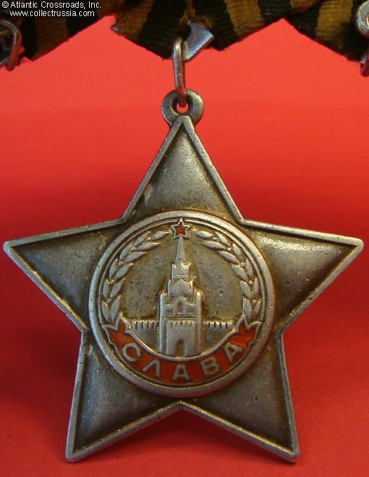 Order of Glory, 3rd cl., Type 2 Var. 1, #113358. Silver, enamels; measures 47.4 mm in height incl. eyelet, 46.5 mm wide; weighs 22.9 g not including the connecting link. In very fine condition. The enamel on the plaque and star has extensive flaking and surface chips, none of which penetrate to silver. Moderate wear to the center medallion and tips of the arms; the details of the medallion are relatively well defined nevertheless. Even dark patina to silver on both sides.