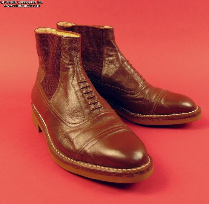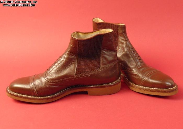 In fine quality brown leather. Specific model for generals, different from regulation shoes for lower-ranking military officers: with elastic bands rather than tie-up laces and high upper with expandable elastic inserts. Size 40 (US size 9).
