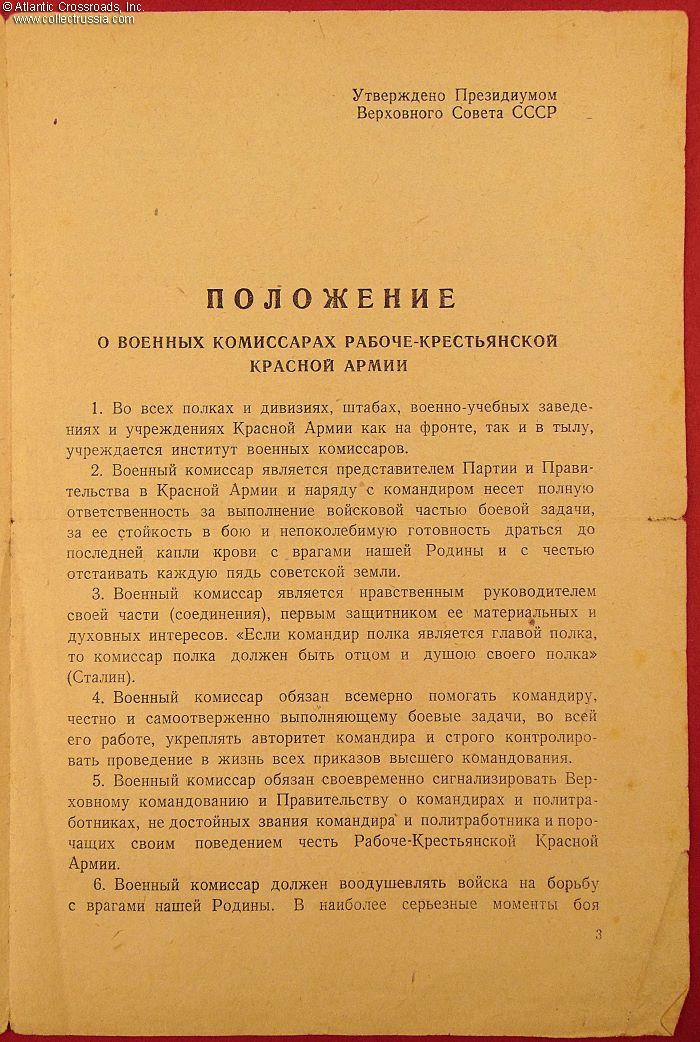 USSR Supreme Council Decree Establishing the Institute of Military Commissars in RKKA, 17 July 1941.
