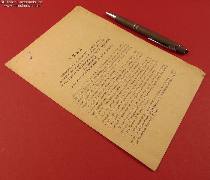Brochure format, measures 6" x 9", 4 pp., published by Navy Publishing House of the Narkomat of the Navy. Circulation 60,000 copies. Contains two documents: (1) Decree of the Presidium of the Supreme Council of the USSR about reorganization of organs of political propaganda and establishment of the institute of military commissars in the Red Army, and (2) the role and responsibilities of military commissars in the Red Army.