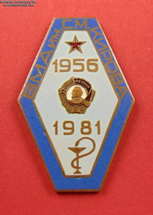 Brass, enamels; 41.5 x 27.3 mm; weighs 12.0 g not including the screw plate. A very large, well-made and impressive piece. Features the Order of Lenin awarded to the school, medical emblem, and dates "1956-1981". The inscription along the upper edge is "S.M. Kirov Naval Academy".
