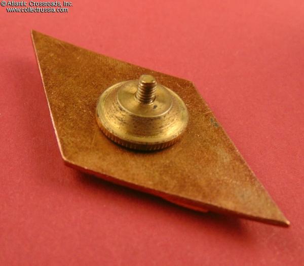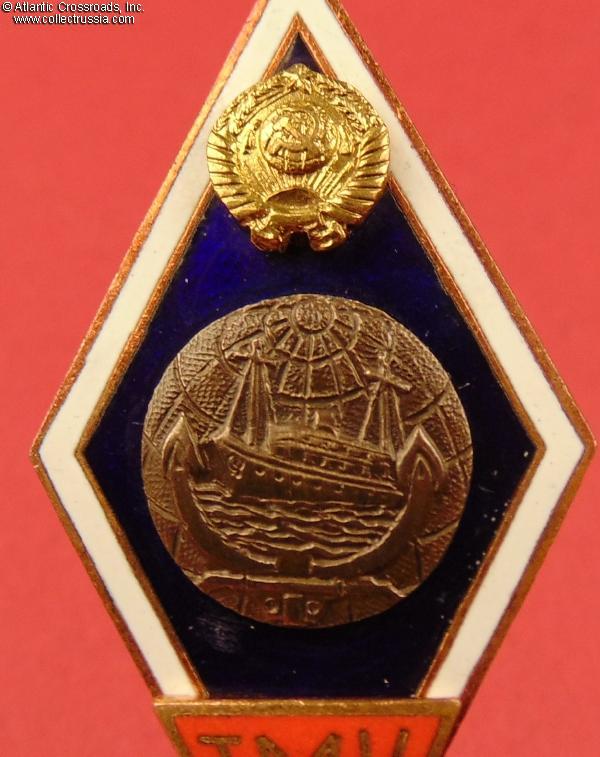 Brass, enamels; 53.6 x 28.3 mm. Four-piece construction: the center medallion, gilded USSR national emblem, and the red plaque with the Cyrillic acronym of the school ТМУ ("TMU") are separate superimposed parts. A large, massive and well-made badge.
