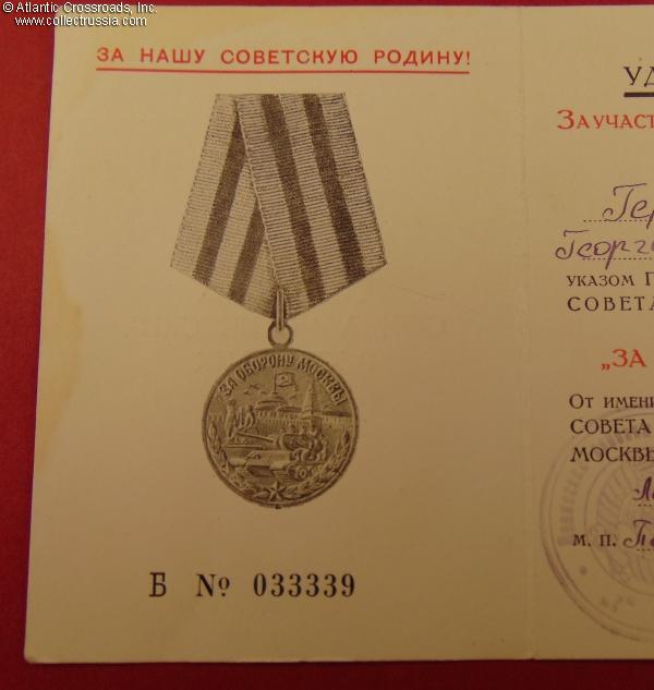 This relatively uncommon "catch-up" award certificate was apparently timed to the Soviet Army anniversary on 23rd February and especially the 20th anniversary of victory celebrations coming later that year. The document can be a perfect match to a post-war "Voenkomat" version of the Defense of Moscow Medal.