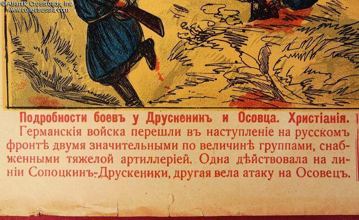 Large lithographic print measuring 24" x 17", printed by M. Morozov Chromo-Lithography Workshop, Moscow. The captions under the artwork are a quote from the 16 September [29 September by Gregorian calendar], 1914 issue of "The Early Morning" newspaper. The captions under the lithograph read "The Details of the Battles at Druskininkai and Osowiec.Christiania. The German troops went on the offensive on the Russian front by two groups of significant size supported by heavy artillery. One of them operated on the line of Sopotzkin - Druskininkai, the other attacked toward Osowiec. The northern group was in desperate offensive action on the Neman, and the attempt to cross this river was indeed the beginning of the unfolding German plan to advance toward Vilno - Kovno. These preparatory operations of high significance had the goal of covering the attack of the second group which was advancing to the south. After bloody and desperate battles, the Germans suffered huge losses and were forced to retreat."