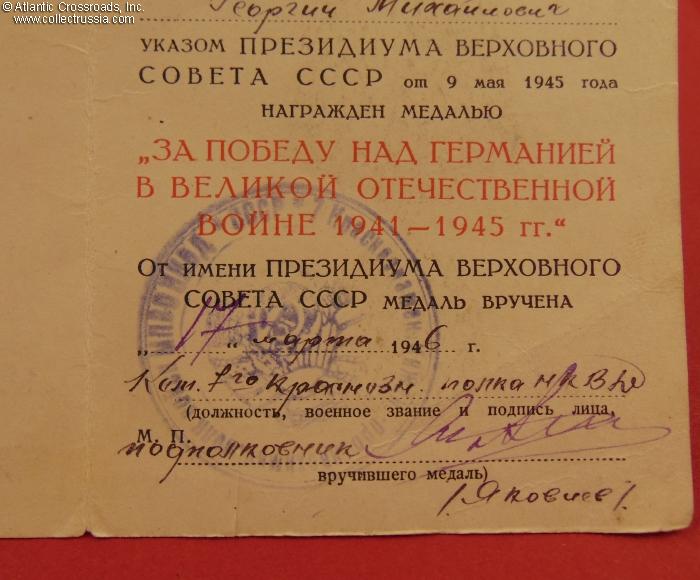 Award Document for the Medal for Victory over Germany, Series G #0476584, issued on 17 March 1946 to Private Georgiy Gerashchenko (Георгий Михайлович Геращенко), 7th NKVD Regiment.