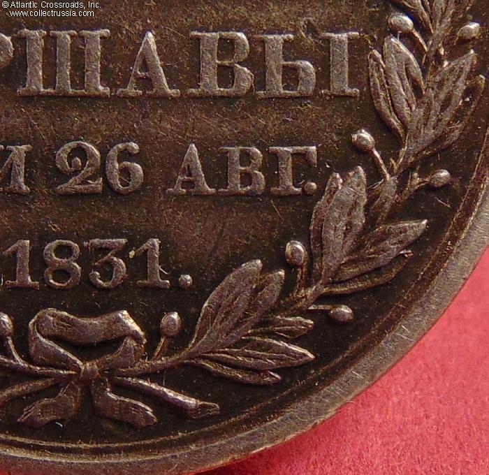 The medal was awarded to all Russian troops as well as chaplains and medical personnel who participated in the storming of Warsaw. The battle that took place on 25-26 August 1831 (according to the old-style Julian calendar) concluded the campaign to crush the Poles unhappy with the new borders drawn by the Congress of Vienna and seeking a republican form of government. After the suppression of the rebellion, Russian authorities implemented harsh measures aimed at further incorporating Poland into the Russian Empire. During the same year Polish orders of the White Eagle and of St. Stanislaus were permanently brought into the system of Russian awards.