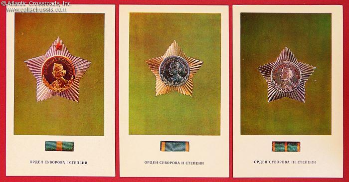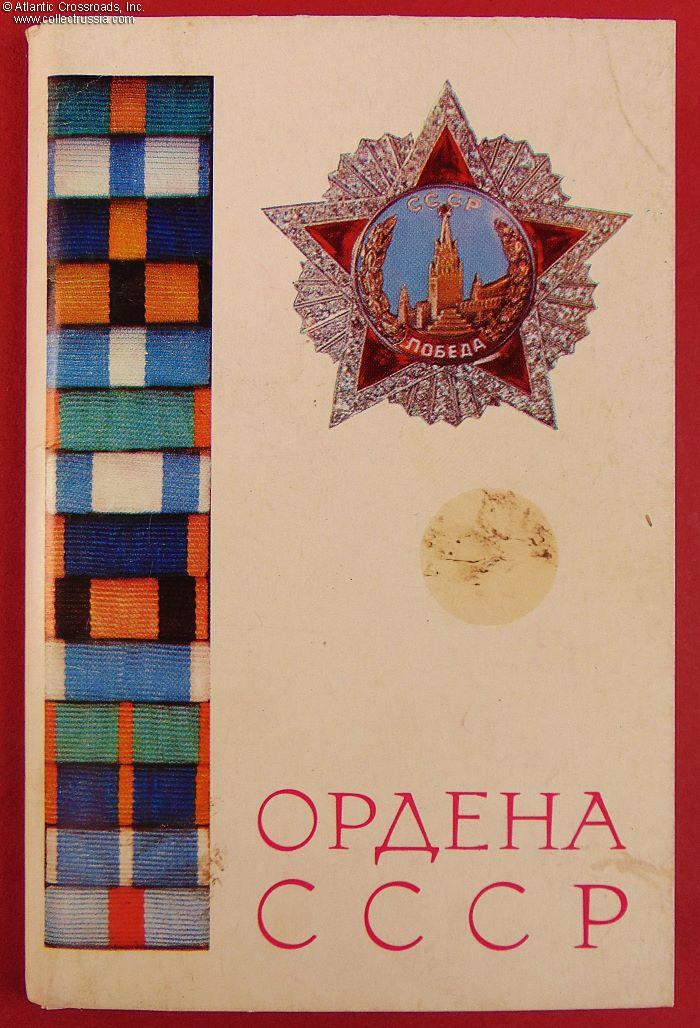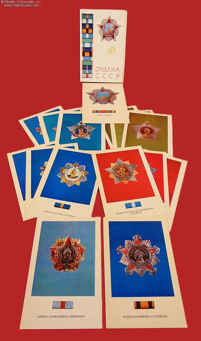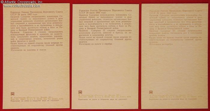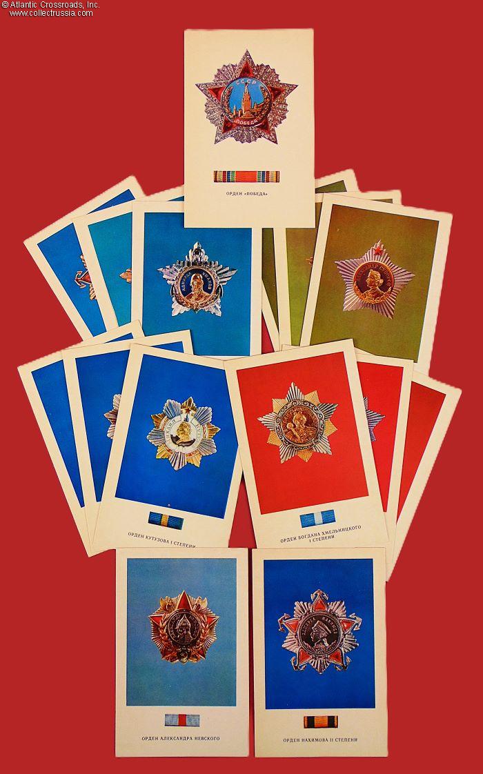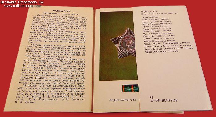 Measures 4" x 5 ½", includes color photos of the Order of Victory and Soviet high decorations established in the names of great Imperial Russian military leaders: Nevsky, Nakhimov, Ushakov, Suvorov, Kutuzov, and Khmelnitsky. Each postcard has the date of establishment and statutory information on the verso. The set comes with an informational brochure with some statutory details and an incomplete list of Soviet military leaders, recipients of these orders.