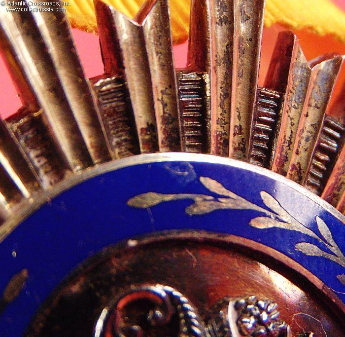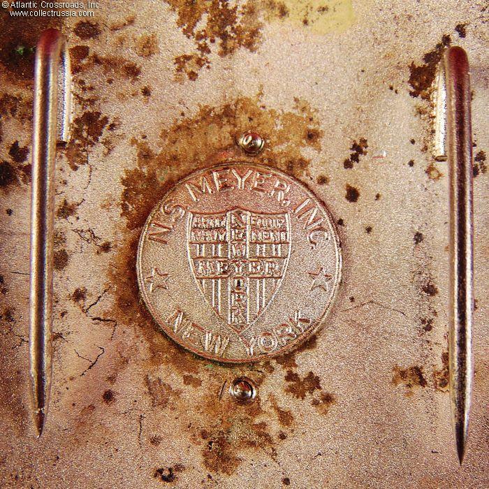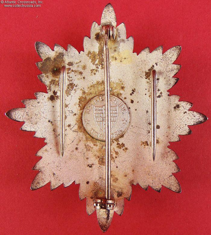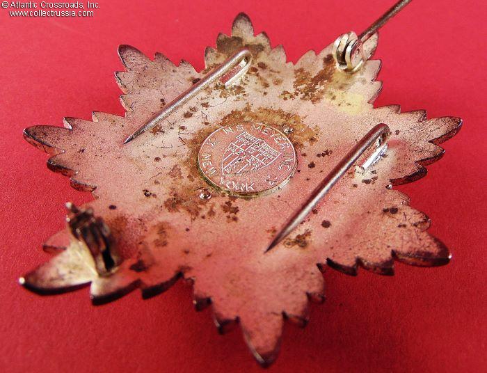 Breast Star. In silver, gold, enamel; 79.5 mm in height, 71.4 mm in width, weighs 80.7 g. The oval center medallion shows a profile bust of Simon Bolivar in gold on gilded silver background, encircled by his name in gold on blue enamel. The reverse is in unpolished silver with a round plaque with the maker's mark in the middle, showing the company's coat of arms and name, "N.S. Meyer Inc., New York." The obverse is in very fine condition, showing a couple minuscule dings to the gilt around Bolivar's bust and mild attractive patina to the tips of the silver rays. The reverse shows mild tarnish. The lock for the vertical pin is in perfect working order.
