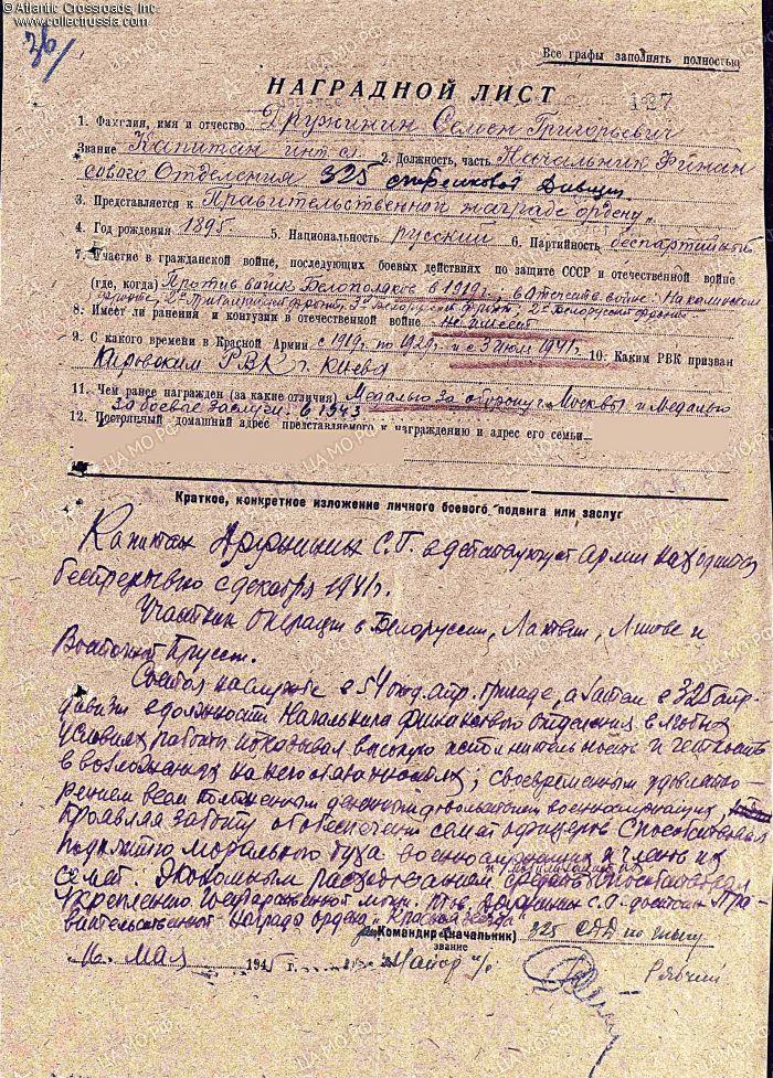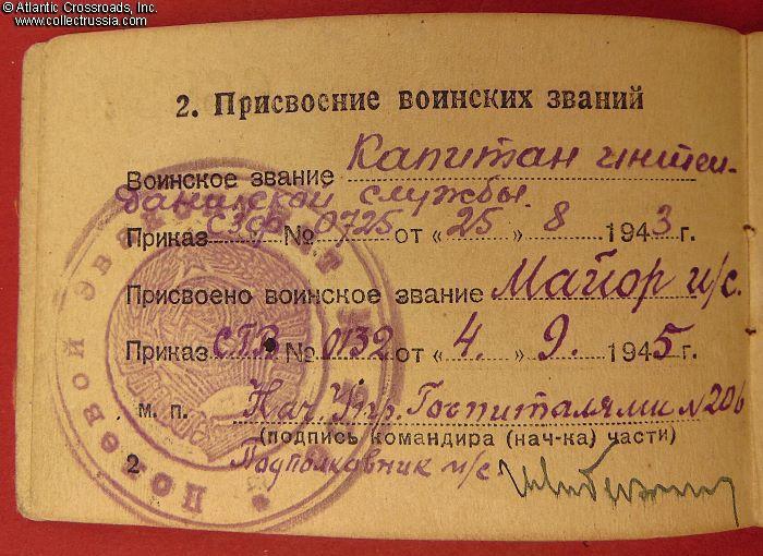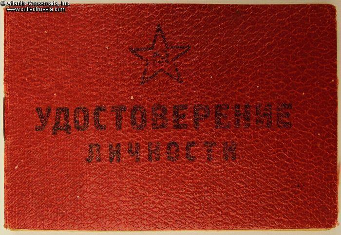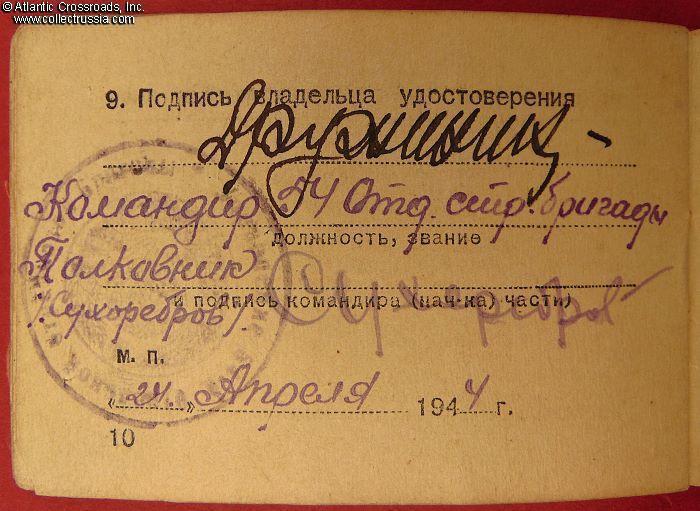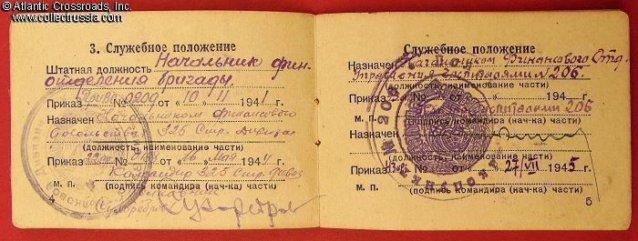 In booklet format measuring 3 ½" x 2 ¼", in oilcloth-bound soft cover. The lettering on the front cover reads "Identification Certificate." According to the ID, Semyon Druzhinin, born in 1895, was promoted to the rank of major on 4 May 1945 and appointed as Chief of the Financial Department of the 206th Directorate of Hospitals. By the end of the Patriotic War, Druzhinin was recommended for the Order of the Red Star for outstanding performance of his duties as a financial officer throughout the war. He was awarded with the order on 1 June 1945. The commendation states that he had also