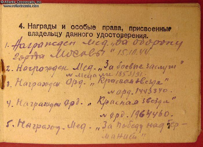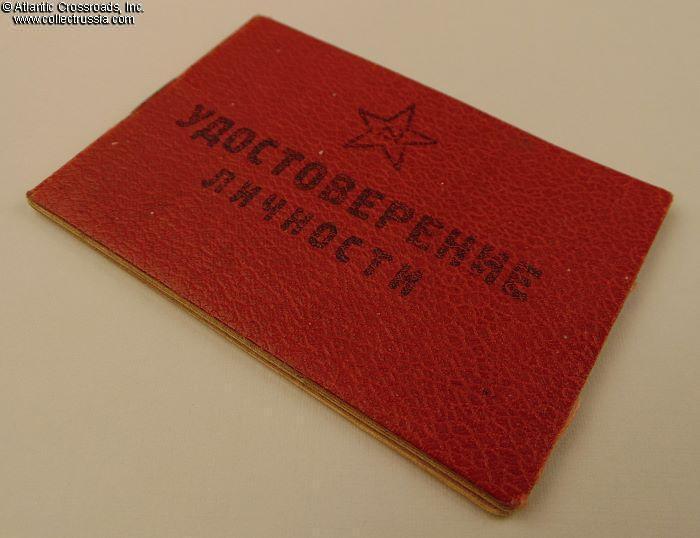 In booklet format measuring 3 ½" x 2 ¼", in oilcloth-bound soft cover. The lettering on the front cover reads "Identification Certificate." According to the ID, Semyon Druzhinin, born in 1895, was promoted to the rank of major on 4 May 1945 and appointed as Chief of the Financial Department of the 206th Directorate of Hospitals. By the end of the Patriotic War, Druzhinin was recommended for the Order of the Red Star for outstanding performance of his duties as a financial officer throughout the war. He was awarded with the order on 1 June 1945. The commendation states that he had also participated in the Russian Civil War in 1919. Two more decorations listed in this ID, the Medal for Combat Service and another Order of the Red Star, were awarded for length of service. On 20 November 1946, Druzhinin retired from military service.