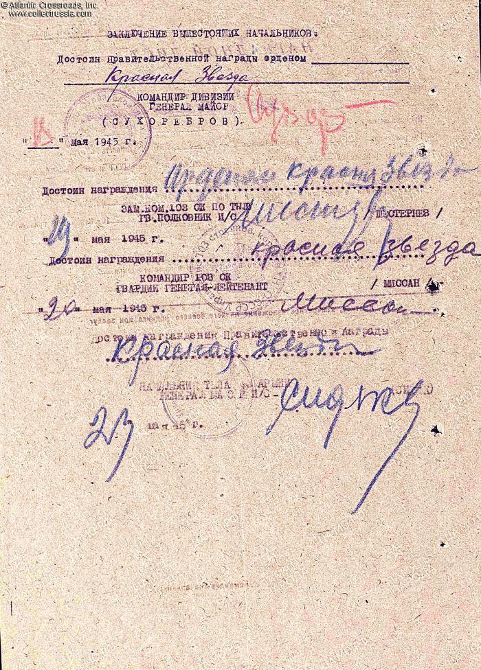 Research Materials: b/w photocopy of the award commendation for the Order of the Red Star.