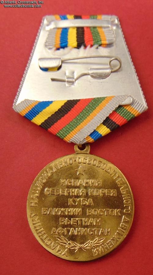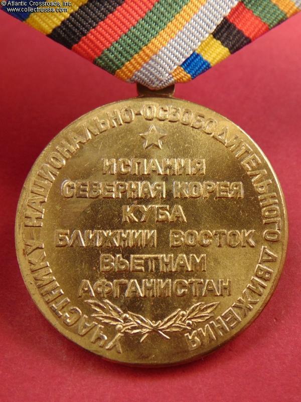 Reverse shows writing along the edge, "To a participant of National Liberation Movement" and, in the center, the list of faraway places where Soviets troops were involved over the years: Spain, North Korea, Cuba, Middle East, Vietnam, Afghanistan.