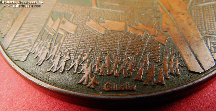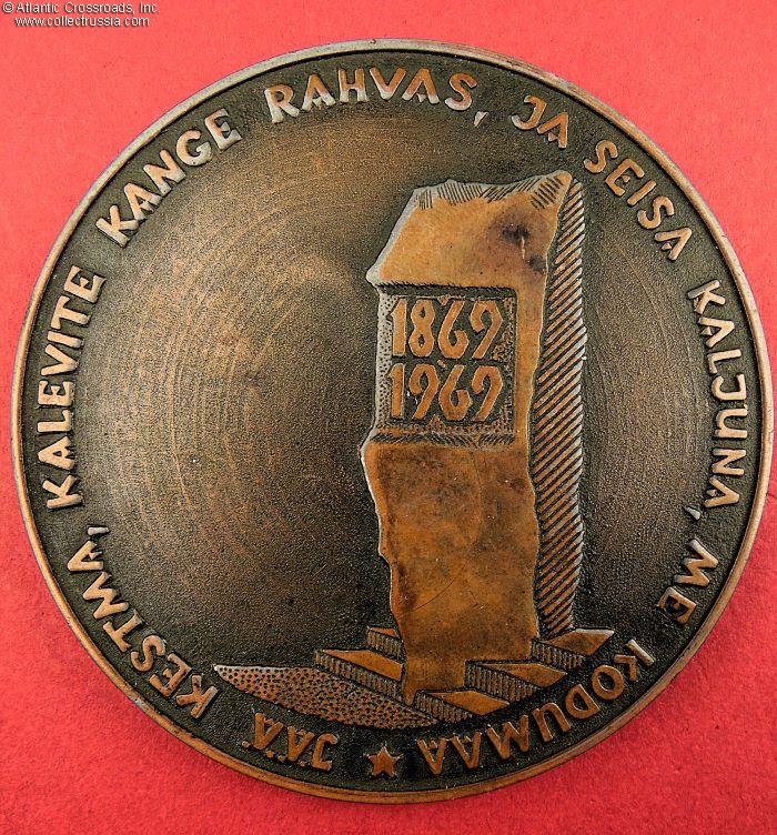 In bronze, 80 mm across. The obverse features the image of the Tallinn Song Festival Grounds arena with the torch on top of its tower lit for the event. The reverse shows a monument with the years of the centennial, encircled by the inscription in Estonian language, reading "May the people of Kalev endure and stand as a rock in our defense," probably referring to the sons of Kalev, the giant hero of Estonian mythology and defender of Estonian people, whose sons were also giants and protectors of Estonians. The medal was designed by G. Loik whose name can be seen at the bottom