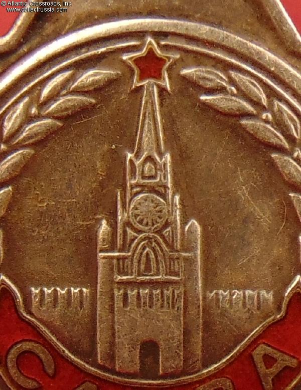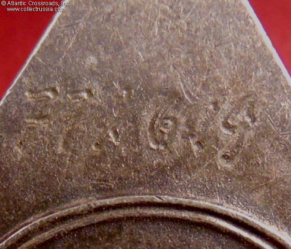 Silver, enamels; 48.2 mm in height incl. eyelet, 46.0 mm in width; weighs 20.8 g not including the suspension and connecting link. Late variation featuring rotating tool-engraved serial number. Classified as Variation 10 Sub-Variation 2 by Mondvor.narod.ru, this version features concentric circles on the reverse that are of approximately equal thickness. Unlike some earlier variations, the outer corners of the letters "CCCP" on the reverse are slightly rounded, not beveled. The currently known serial number range for this sub-variation is 755495 - 813370.