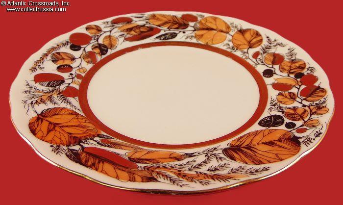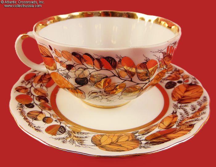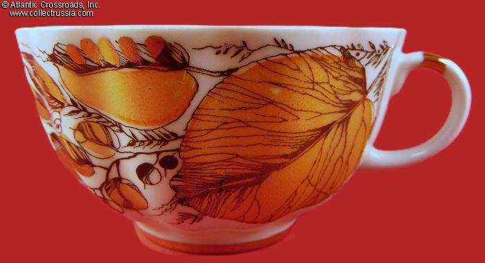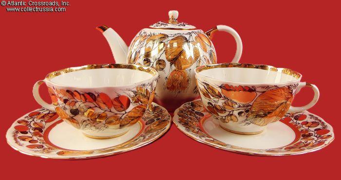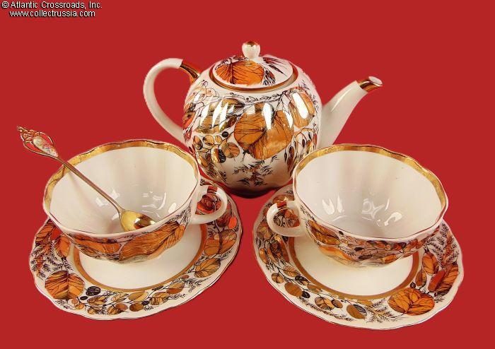 Hand-Painted Tea Service for 2 Persons Autumn Leaves, by LFZ (ЛФЗ), marked for export, 5 pieces, 1972-86.