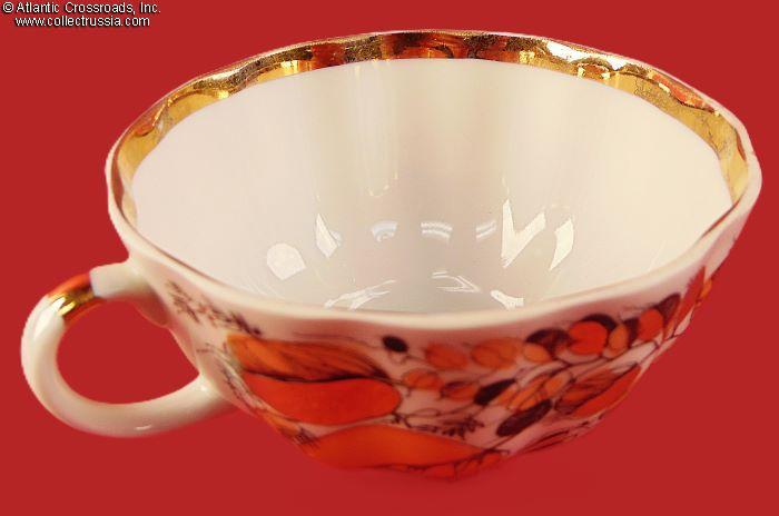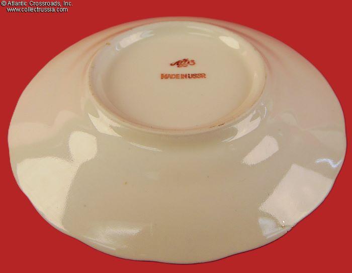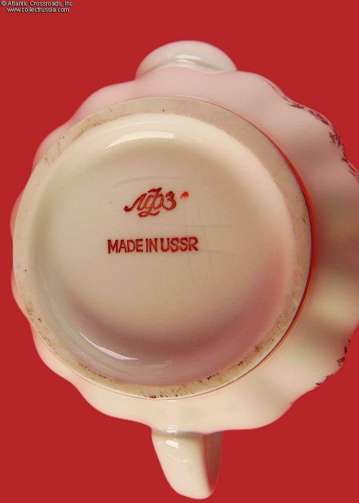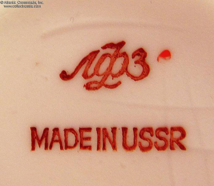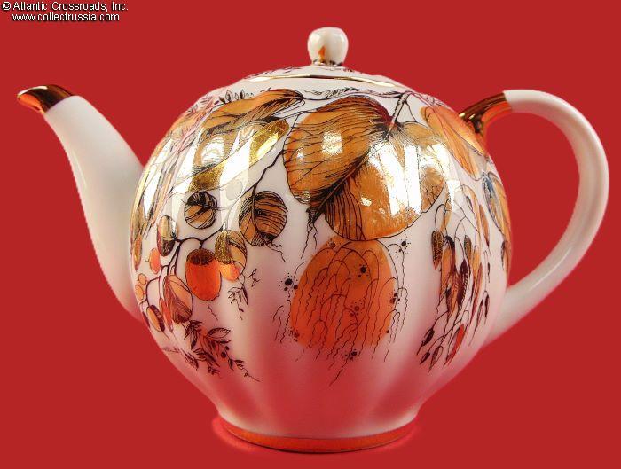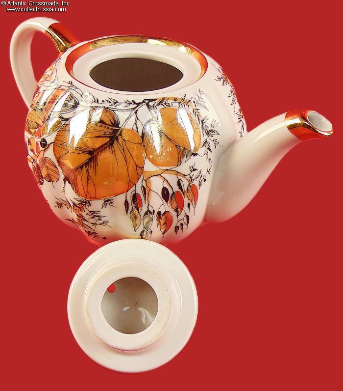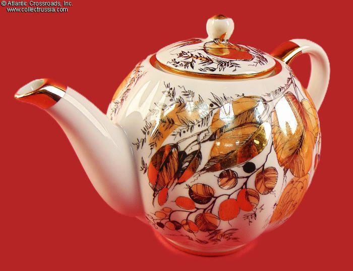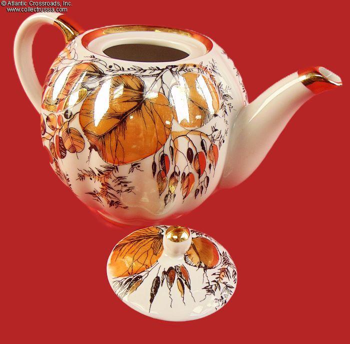 The set includes a tea pot with lid and two cup-and-saucer pairs, exquisitely painted with an autumnal foliage motif. The teapot stands a little over 5" to the tip of the lid. The cups measure 2 ¼" in height, 4" across at the lip, 2" wide at the base. The saucers are 6" across. Each item is maker marked on the bottom (fig. # 493 in Volume One of Marks on Soviet Porcelain, Faience, and Majolica, 1917-1991 by Nasonova et al). The red "MADE IN USSR" denotes that this set met the highest LFZ quality control requirements, the usual Soviet-era practice for items designated for export.