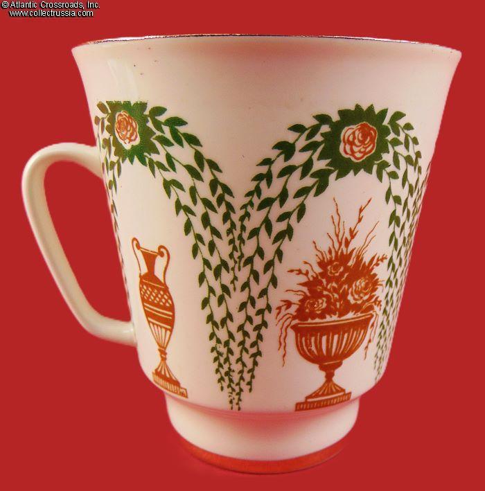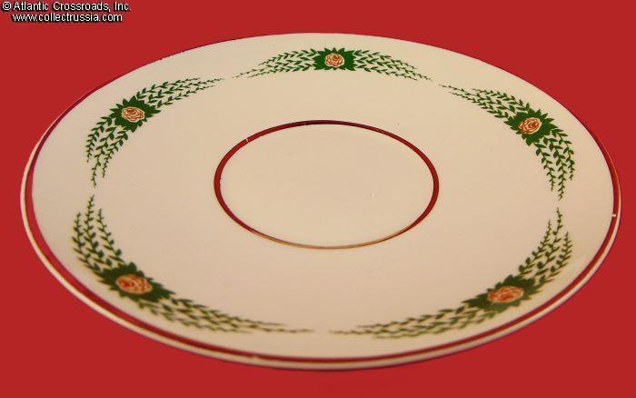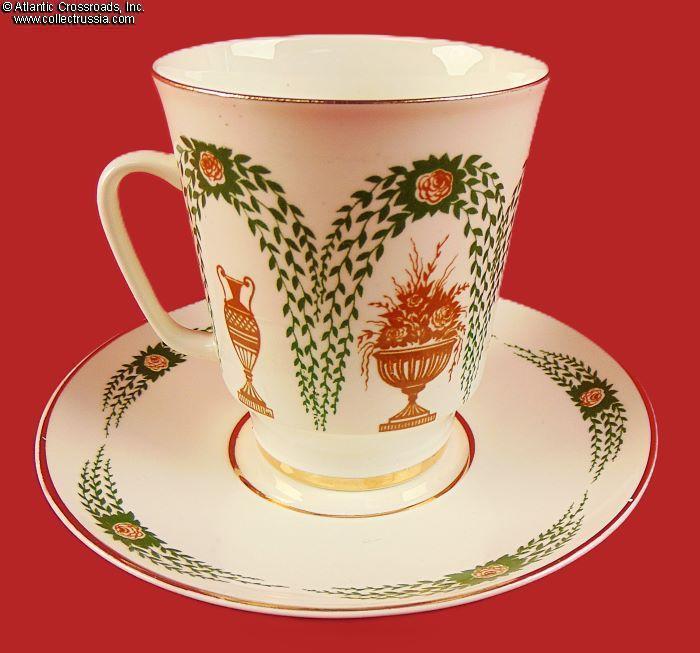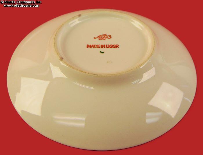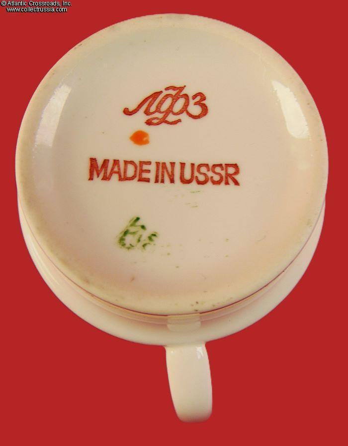 The lot includes two cups and two saucers, sparingly and elegantly painted. The cups stand 3" tall, measuring 2 ¾" wide at the lip and 1 ½" across at the foot. The saucers are 4 ¾" across. Each item is maker marked on the bottom (fig. # 493 in Volume One of Marks on Soviet Porcelain, Faience, and Majolica, 1917-1991 by Nasonova et al). The red "MADE IN USSR" denotes that this set met the highest LFZ quality control requirements, the usual Soviet-era practice for items designated for export.