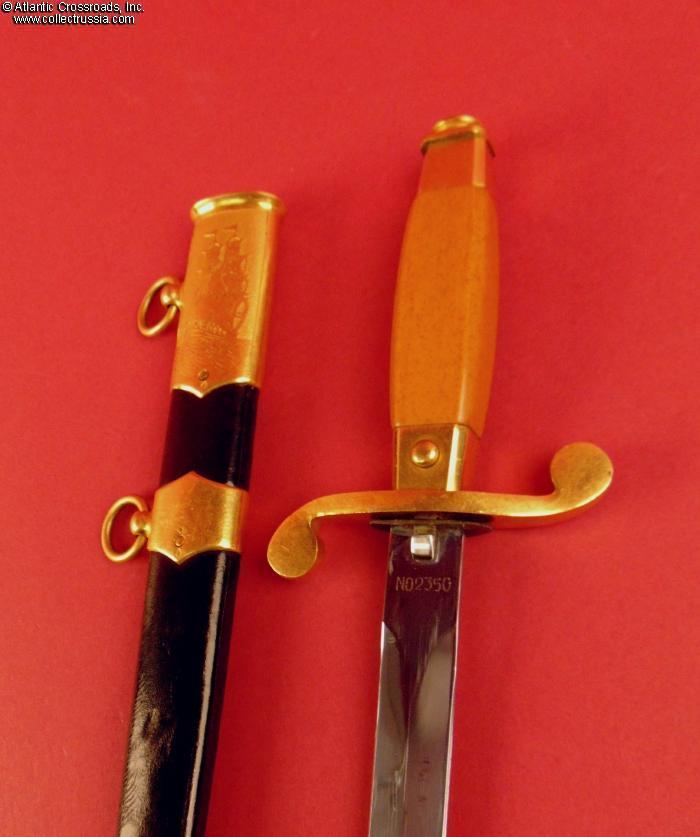 Maker-marked "ZIK" on the ricasso; on the other side of the blade has engraved alphanumeric serial number "N02350". The pommel displays the appropriate Soviet State emblem of the 1946-56 style, with 16 scrolls representing the number of republics in the Soviet Union. The beautiful quality is typical of Soviet daggers produced in the early part of the 50s; note in particular the nice gold plating on the brass parts. The handle grip is in a very attractive lightly speckled medium-toned Bakelite. The dagger measures approx. 13.5" (34 cm) when in scabbard. There are diamond-shaped m
