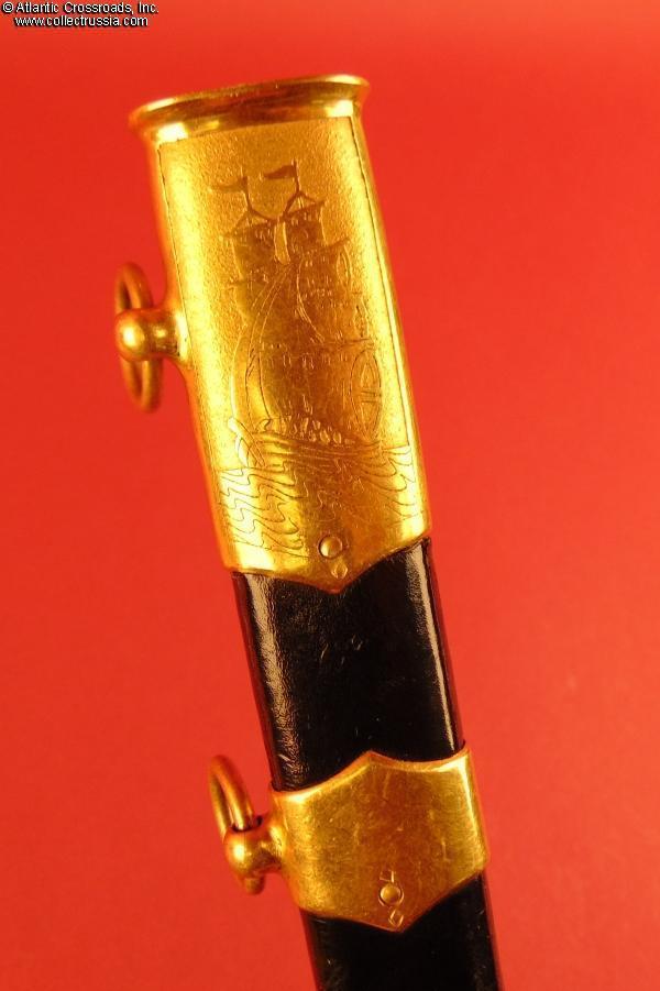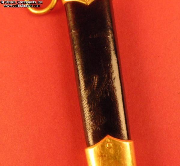 Maker-marked "ZIK" on the ricasso; on the other side of the blade has engraved alphanumeric serial number "N02350". The pommel displays the appropriate Soviet State emblem of the 1946-56 style, with 16 scrolls representing the number of republics in the Soviet Union. The beautiful quality is typical of Soviet daggers produced in the early part of the 50s; note in particular the nice gold plating on the brass parts. The handle grip is in a very attractive lightly speckled medium-toned Bakelite. The dagger measures approx. 13.5" (34 cm) when in scabbard. There are diamond-shaped maker marks stamped near the rivets of the scabbard; a matching maker mark is also stamped onto the leather on the same side under the upper fitting.